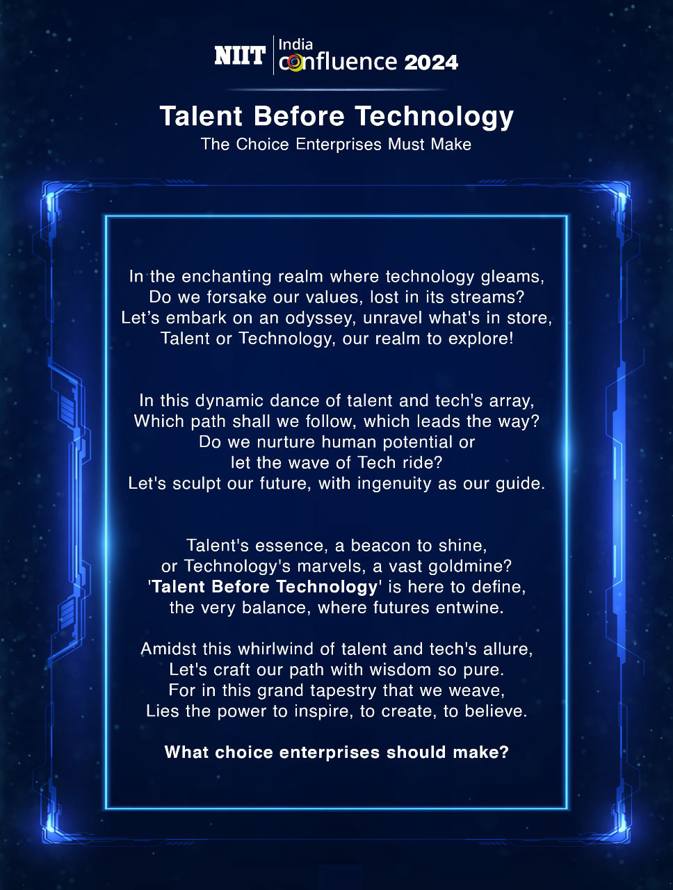 The theme for NIIT India Confluence 2024 is ‘Talent Before Technology: The Choice Enterprises Must Make’. This year promises to be an event full of challenging debates, significant sense-making, and of course fun and networking in between!