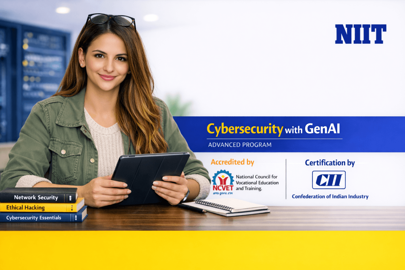 The Cybersecurity with GenAI Advanced Program by NIIT is a future-ready program with placement assistance that equips learners with job-ready cybersecurity skills through hands-on projects and real-world simulations, preparing them for modern cyber defense roles. This program is accredited by the National Council for Vocational Education and Training (NCVET), with industry certification awarded by the Confederation of Indian Industry (CII). Students can earn Academic Bank of Credits (ABC), gaining nationally recognized credentials that provide flexibility, and open pathways for seamless career progression across institutions and programs.