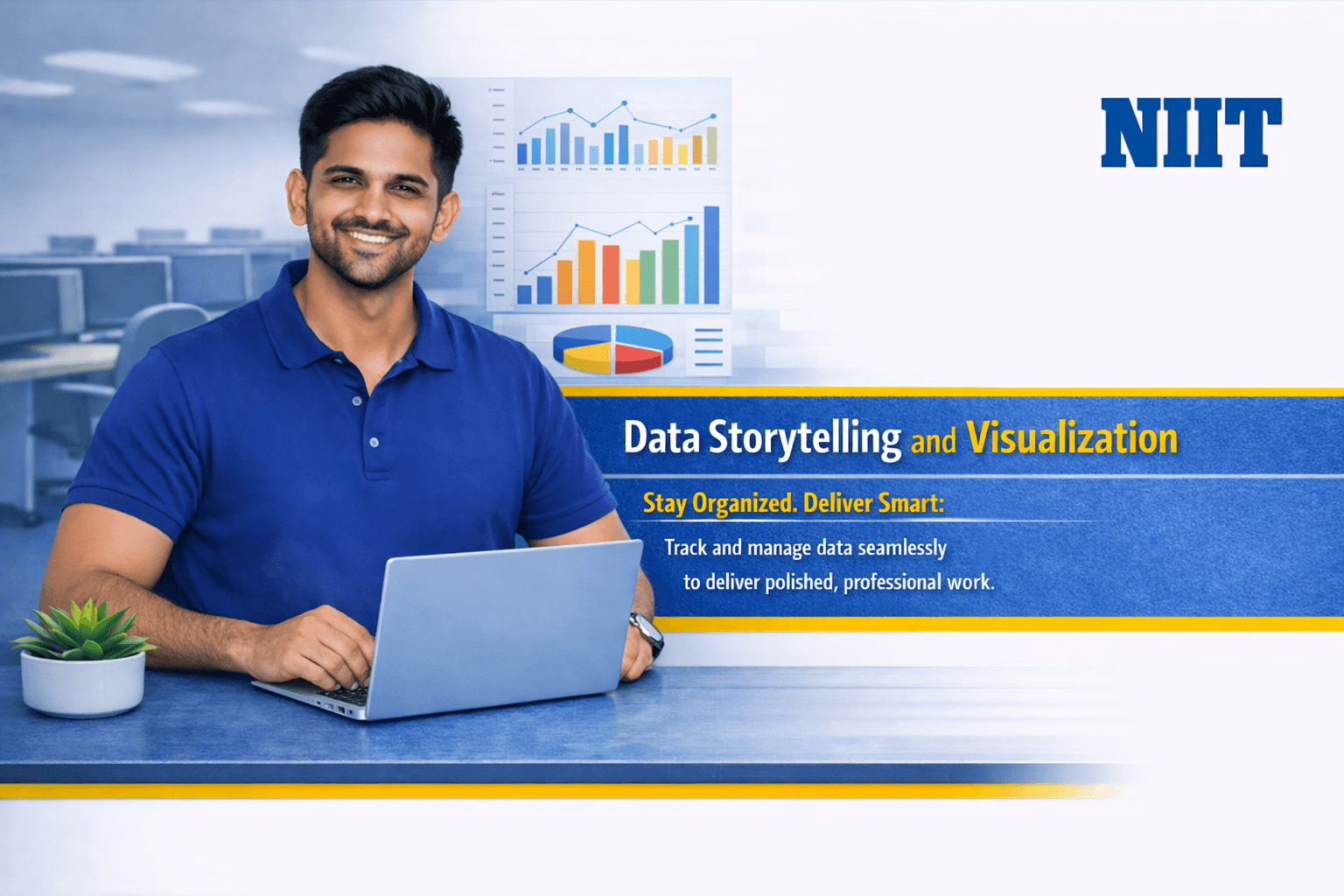 The Data Storytelling and Visualization program by NIIT is a Skill-Up Accelerator that equips learners with essential data analysis and visualization skills. Participants learn to transform raw data into compelling visual stories using Excel, charts, PivotTables, and dashboards, analyze datasets effectively, and communicate insights clearly, preparing them for roles like Data Analyst, Business Analyst, and Visualization Specialist in analytics, business intelligence, and reporting domains.