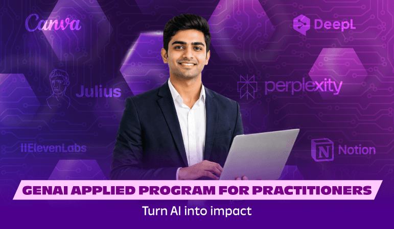 GenAI Applied Program for Practitioners is a mentor-led program that helps professionals build practical fluency in Generative AI. Through multiple live sessions, learners use 17+ AI tools to enhance productivity, communication, creativity, and workflow efficiency. The program covers prompting, email drafting, meeting summaries, document analysis, data insights, content creation, avatar videos, podcasts, portfolio building, workflow automation, and creating a personal AI agent. Each session is based on real use cases and delivers reusable outputs. A bonus session teaches how to configure AI as a personal assistant for real work goals, enabling confident, effective application at work.