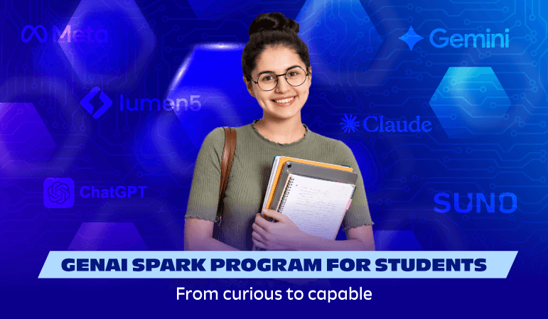 GenAI Spark Program for Students is an online, mentor-led course that helps learners use GenAI to study smarter, create better, and communicate clearly. In a structured 4-sprint format with hands-on practice, students learn to use 15+ tools like ChatGPT, Claude, NotebookLM, Napkin AI, Gemini, HeyGen, Suno, and ElevenLabs. They create notes, visuals, presentations, videos, and simple AI assistants. The program also builds skills in responsible AI use, improving outputs, and fact-checking. By the end, learners can use AI independently to boost learning, creativity, confidence, and future readiness.