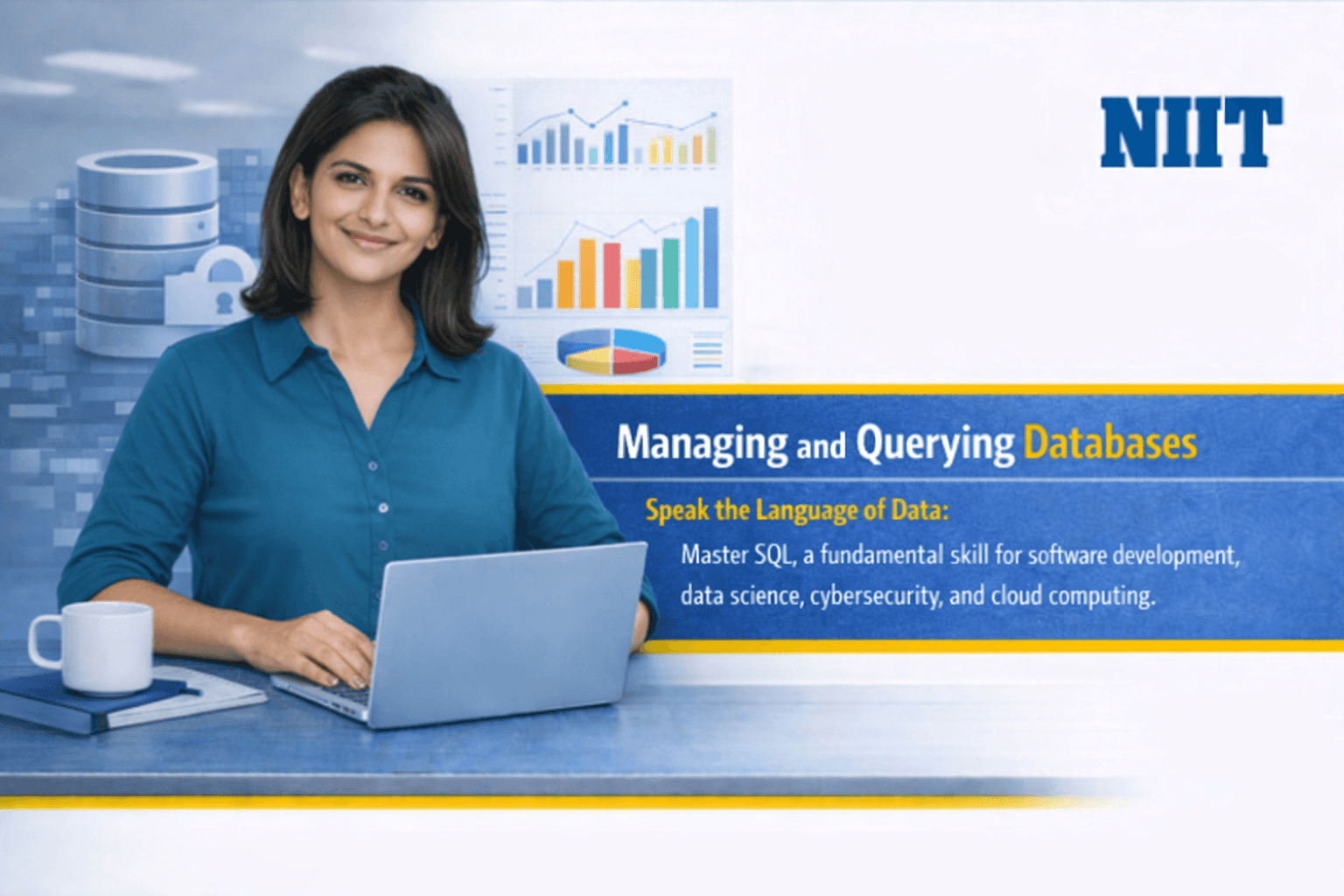 The Managing and Querying Database program by NIIT is a Skill-Up Accelerator that equips learners with essential database management skills and hands-on experience with SQL and NoSQL tools. Participants learn to design, query, and optimize relational and non-relational databases, ensure data integrity, and handle real-world datasets, preparing them for roles like Database Administrator, Data Analyst, and SQL Developer in software, analytics, and cloud domains.