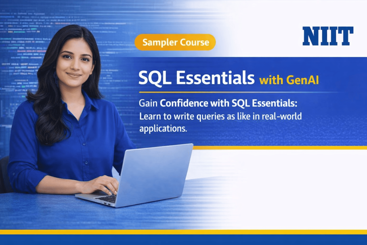 Get a quick introduction to database querying with the SQL Essentials with GenAI sampler course from NIIT. Learn SQL fundamentals such as writing SELECT queries, filtering and sorting data, using joins, and summarizing information with aggregate functions. The course also introduces how Generative AI tools can assist in generating and improving SQL queries for faster data analysis.